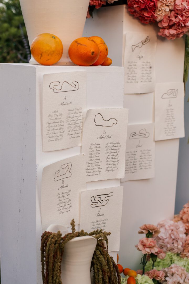 Los meseros fueron el toque más original: cada mesa llevaba el trazado de un circuito mítico (Jerez, Imola, Albert Park…). Un detalle muy “ellos” que hizo sonreír a los amigos petrolheads y que se leyó perfecto en la distancia gracias al contraste de tinta sobre fondo geométrico suave. Entre flores voluminosas y cadenas de kumquats, los meseros actuaban como pequeñas obras gráficas, añadiendo ritmo y tema de conversación.