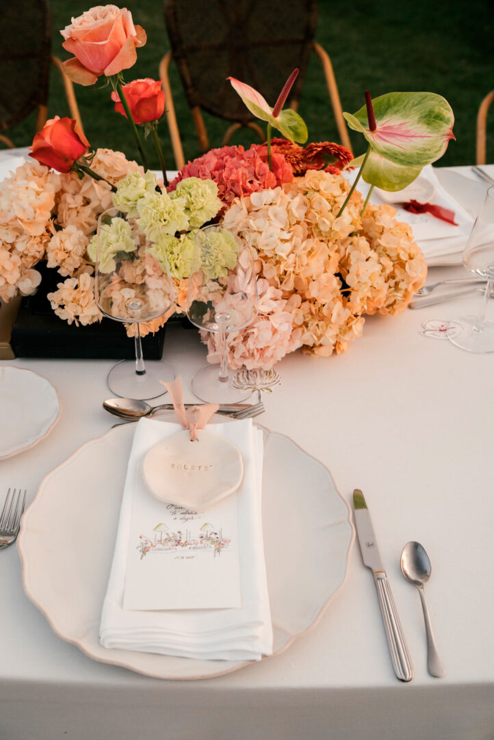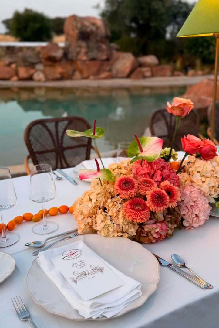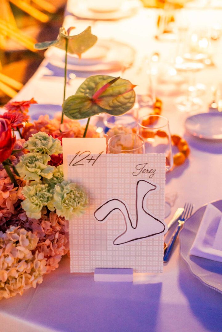 Esta boda nació de un guiño personal de los novios: su pasión por el motor. En la boda, se combinó con una estética mediterránea muy fresca —hidrangeas, claveles y naranjas— y el resultado fue una celebración elegante, luminosa y con mucha personalidad. Todo estaba pensado para contar esa historia desde que el invitado llegaba… hasta que encontraba su sitio.