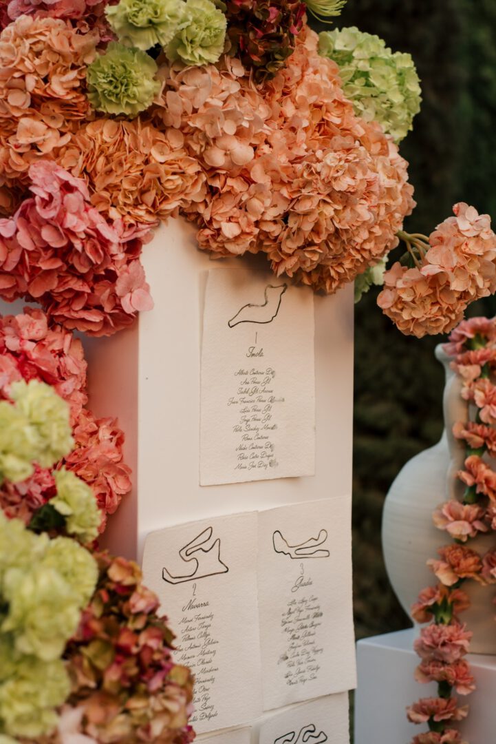 El seating plan se convirtió en un escaparate: columnas blancas de distintas alturas, jarrones de barro, montañas de hortensias y claveles en degradado coral–melón–verde, y salpicaduras de cítricos. Sobre ese paisaje, las tarjetas con bordes irregulares y circuitos dibujados a mano marcaban cada mesa. Decoración y papelería no competían: se potenciaban. El resultado fue una pieza escenográfica que todos fotografiaron.