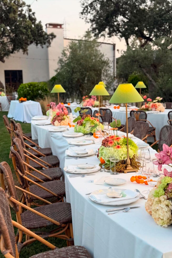 Centros generosos de hortensias, gerberas y anthurium en tonos melocotón y verde manzana se alternaban con cordones de pequeñas naranjas. Las lámparas de pantalla verde oliva aportaron una luz cálida y bajita que convirtió la mesa en un salón al aire libre. Vajilla marfil de borde ondulado y cristalería con relieve redondearon una puesta en escena amable y muy apetecible.