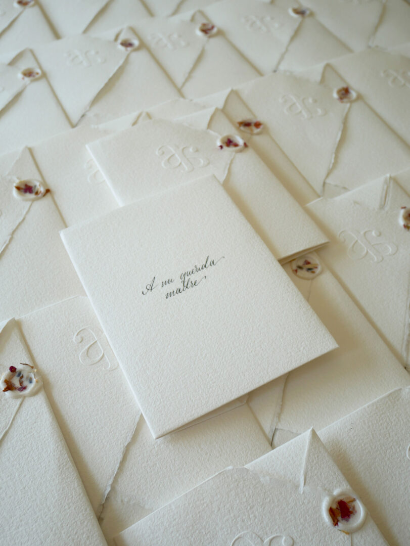 - Lacre blanco con inclusiones de pétalos secos. Un gesto artesanal que aporta singularidad a cada sobre: no todos los lacres son iguales, y las inclusiones florales hacen que cada envío sea único.