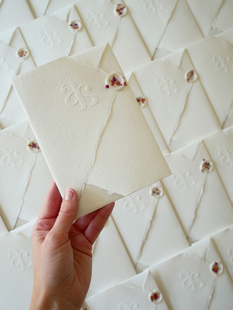 - Monograma en relieve (blind emboss). Un sello sutil, elegante y repetible que actúa como emblema de la boda: discreto pero distintivo.