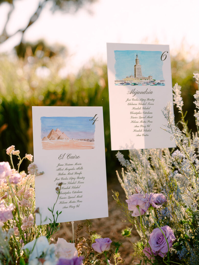 Una gran tabla con los nombres y las mesas puede personalizarse con tipografía elegante, ilustraciones florales o incluso acuarelas personalizadas. Ideal para bodas con estética romántica o natural.