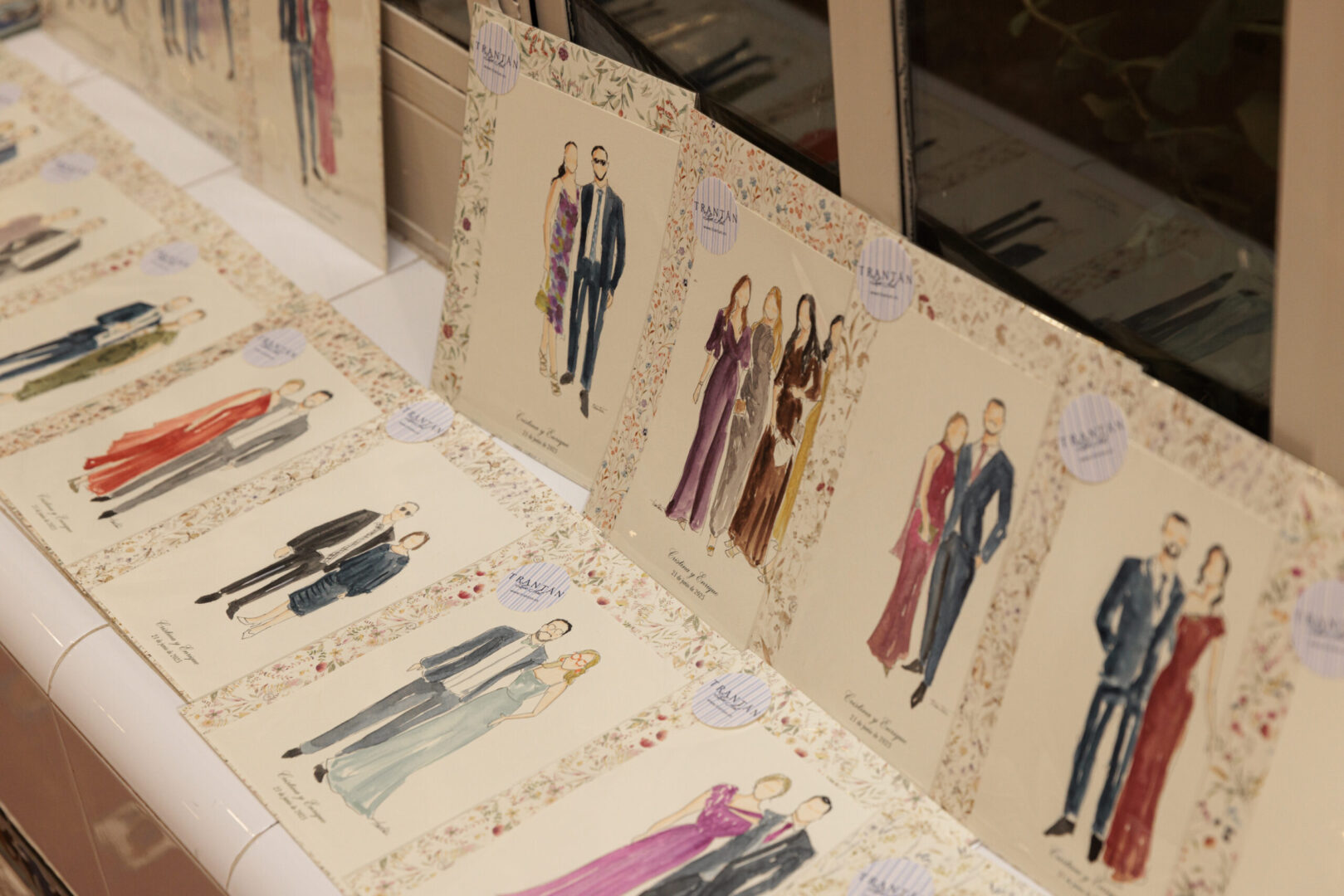 Durante las cuatro horas habituales de servicio ilustramos alrededor de 30 láminas, lo que equivale a unos 60 invitados retratados en parejas. Es la medida perfecta para ofrecer un recuerdo único a un buen número de personas sin que se convierta en una espera interminable.
