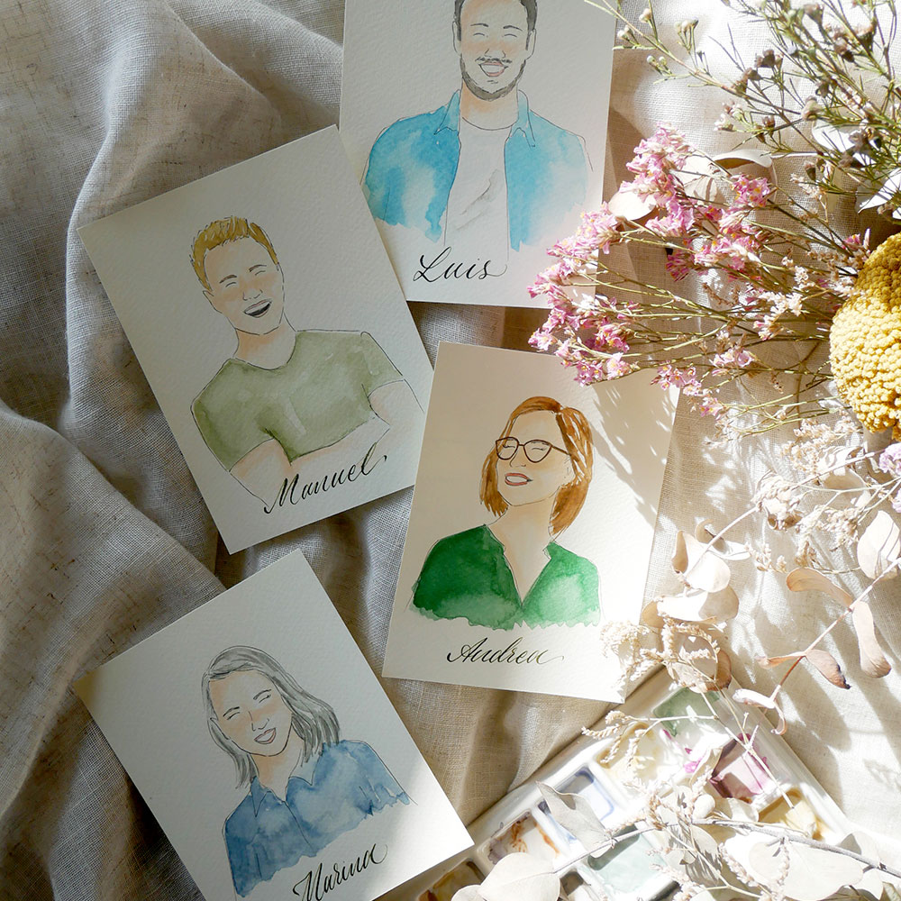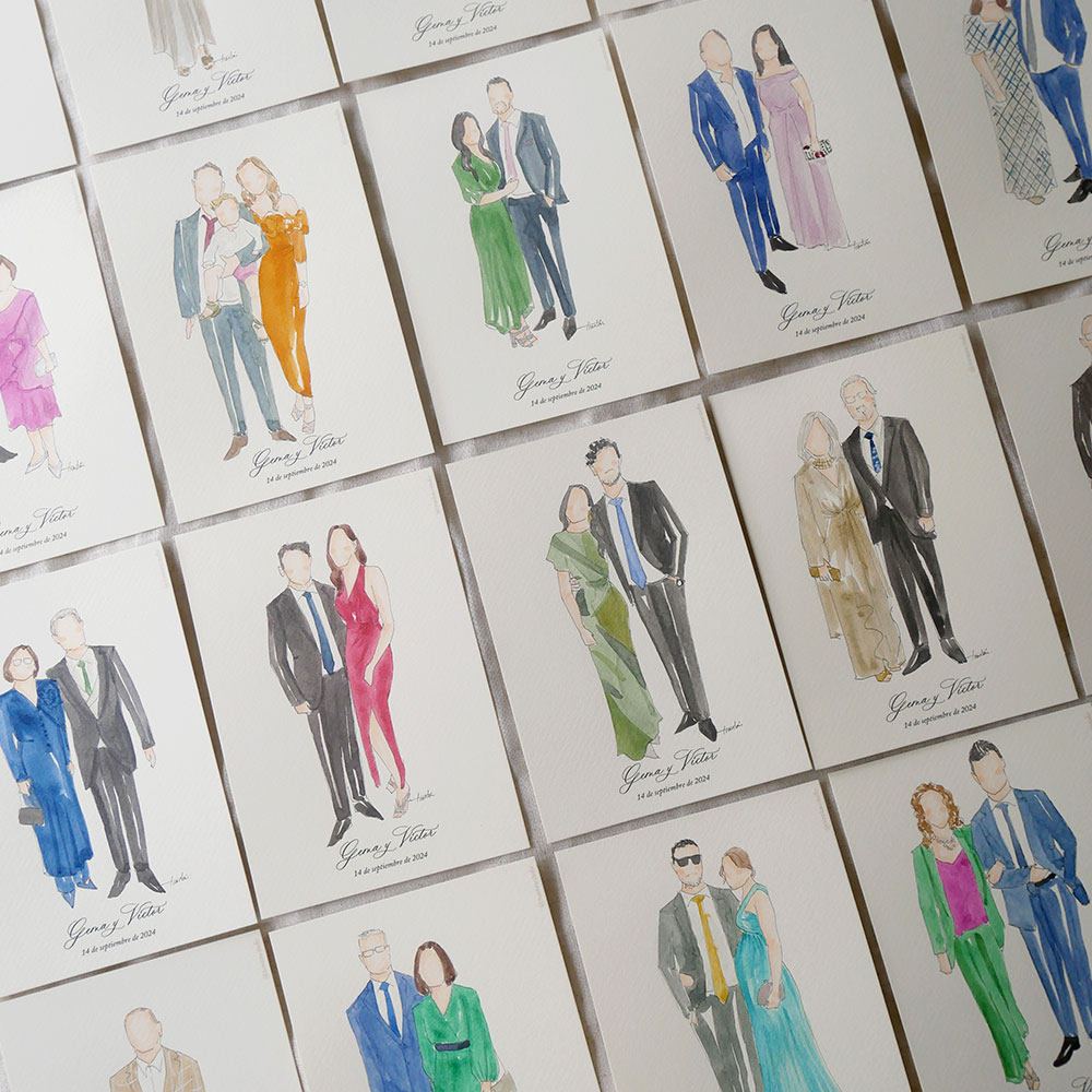 Queremos que nadie se quede sin su recuerdo. Por eso ofrecemos el servicio de Postboda: todas las fotos de los invitados que no se hayan podido ilustrar se convierten en acuarelas en nuestro estudio y os las entregamos en un plazo máximo de 21 días. Así, podéis repartirlas más adelante a vuestros seres queridos.