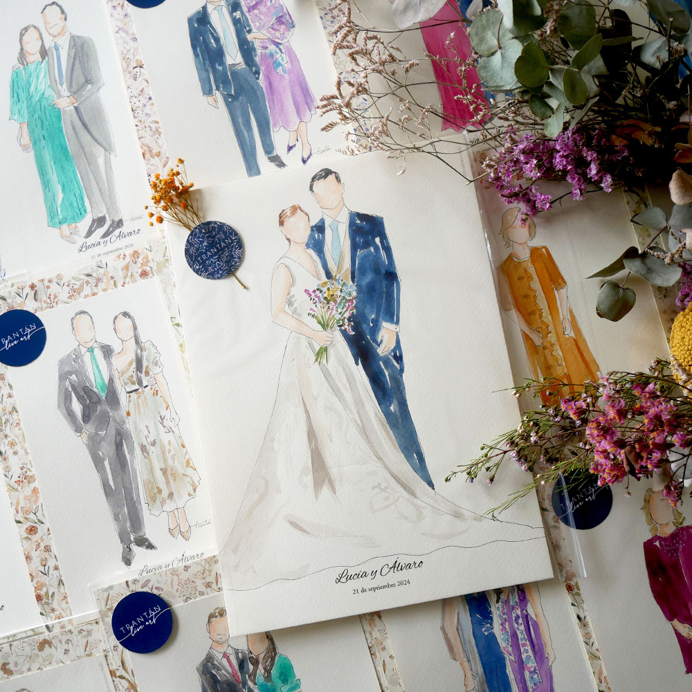 ¡Por supuesto! Todas las ilustraciones se realizan en papel de acuarela de alto gramaje, en tamaño A5, y llevan vuestros nombres y la fecha de la boda impresos. Además, cada acuarela se entrega protegida y con un bonito envoltorio para que se convierta en un detalle cuidado y especial. También podéis elegir si preferís que las acuarelas vayan empaquetadas con nuestros estampados de flores de colección o con una lámina de color liso detrás.