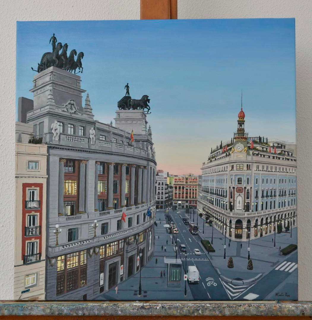 Amanecer en Alcalá: cielo suave, fachadas encendidas y cuadrigas recortadas en lo alto. Madrid elegante, con calma de primera hora. Óleo original, firmado y listo para colgar: trae luz, ciudad y ganas de paseo. Perfecto para salón o despacho