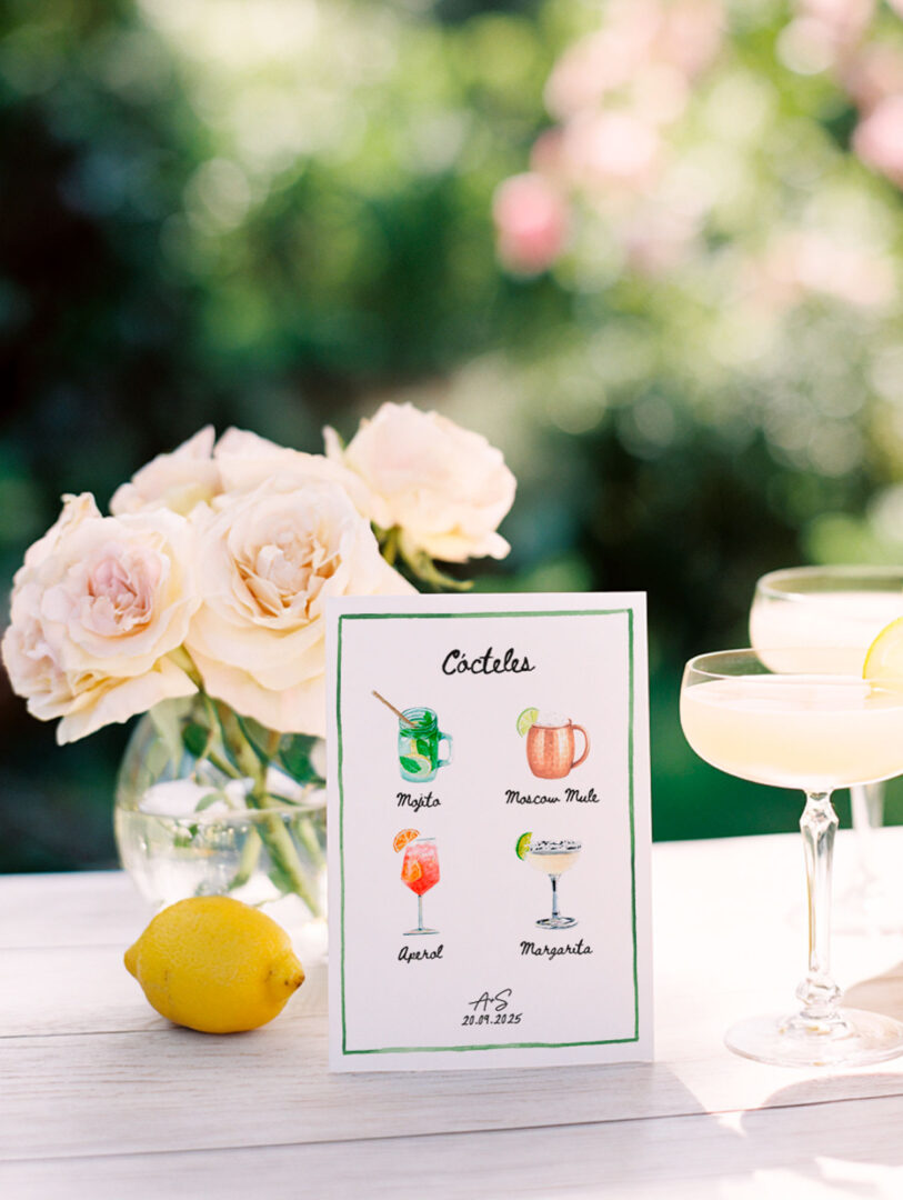 La forma más bonita de anunciar vuestra barra libre. Este cartel con fondo marfil y acuarelas delicadas, aporta esa elegancia natural que convierte la zona de cócteles en un rincón irresistible. Cada bebida está ilustrada con mimo y detalle para que el resultado sea un cartel muy bonito estéticamente. Lo personalizamos con vuestras bebidas favoritas y la tipografía que más os guste, manteniendo la armonía con el resto de la papelería de boda. Un detalle personalizado que habla de vuestro estilo, cuida cada detalle y ayuda a que el open bar fluya con gusto. Perfecto para sorprender y crear recuerdos únicos del gran día.