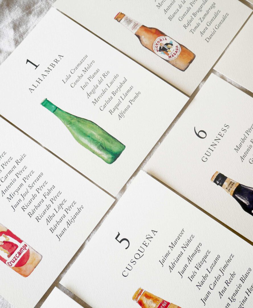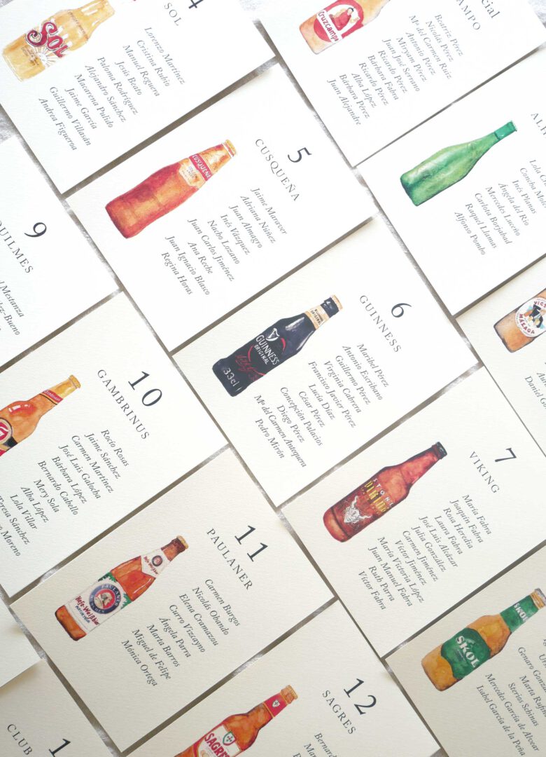 Un brindis para empezar la celebración. Este seating plan está inspirado en el mundo de la cerveza: sus estilos, sus matices y su espíritu alegre y compartido. Cada mesa lleva el nombre de una cerveza distinta, ilustrada en acuarela con el toque artesanal que nos define.