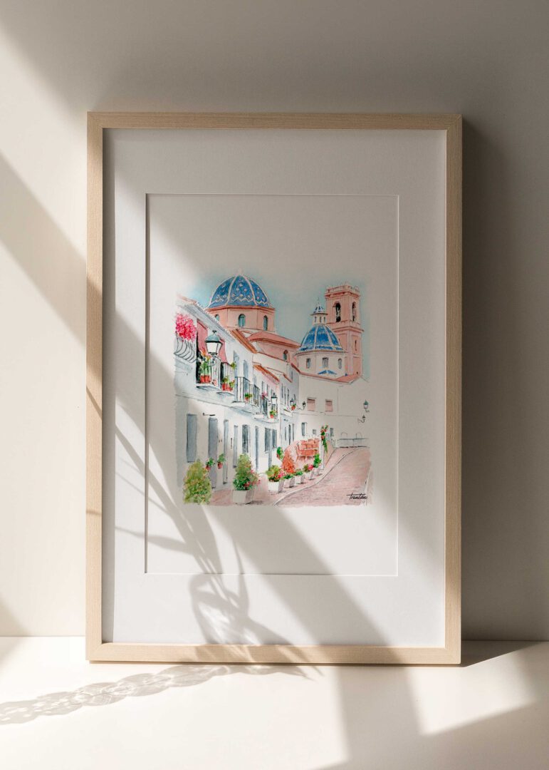 Lámina decorativa de ciudad ilustrada en acuarela, impresa en alta calidad y pensada para aportar calma, personalidad y un estilo atemporal a cualquier espacio. Ideal para decoración de interiores.