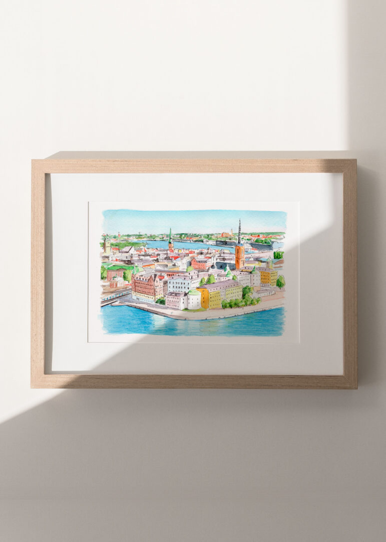 Lámina decorativa de ciudad ilustrada en acuarela, impresa en alta calidad y pensada para aportar calma, personalidad y un estilo atemporal a cualquier espacio. Ideal para decoración de interiores.