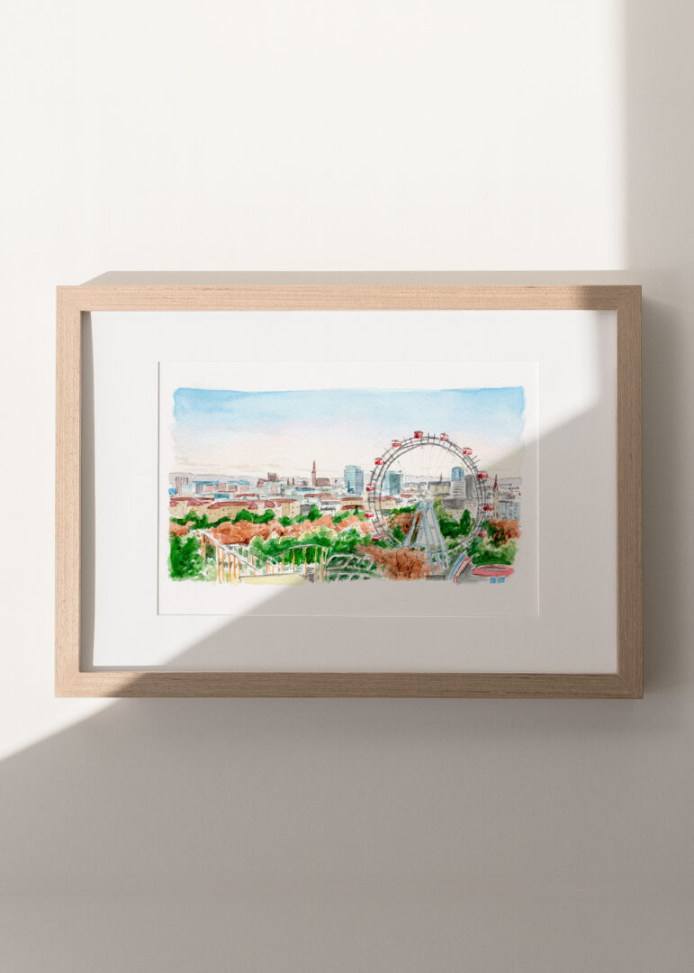 Lámina decorativa de ciudad ilustrada en acuarela, impresa en alta calidad y pensada para aportar calma, personalidad y un estilo atemporal a cualquier espacio. Ideal para decoración de interiores.