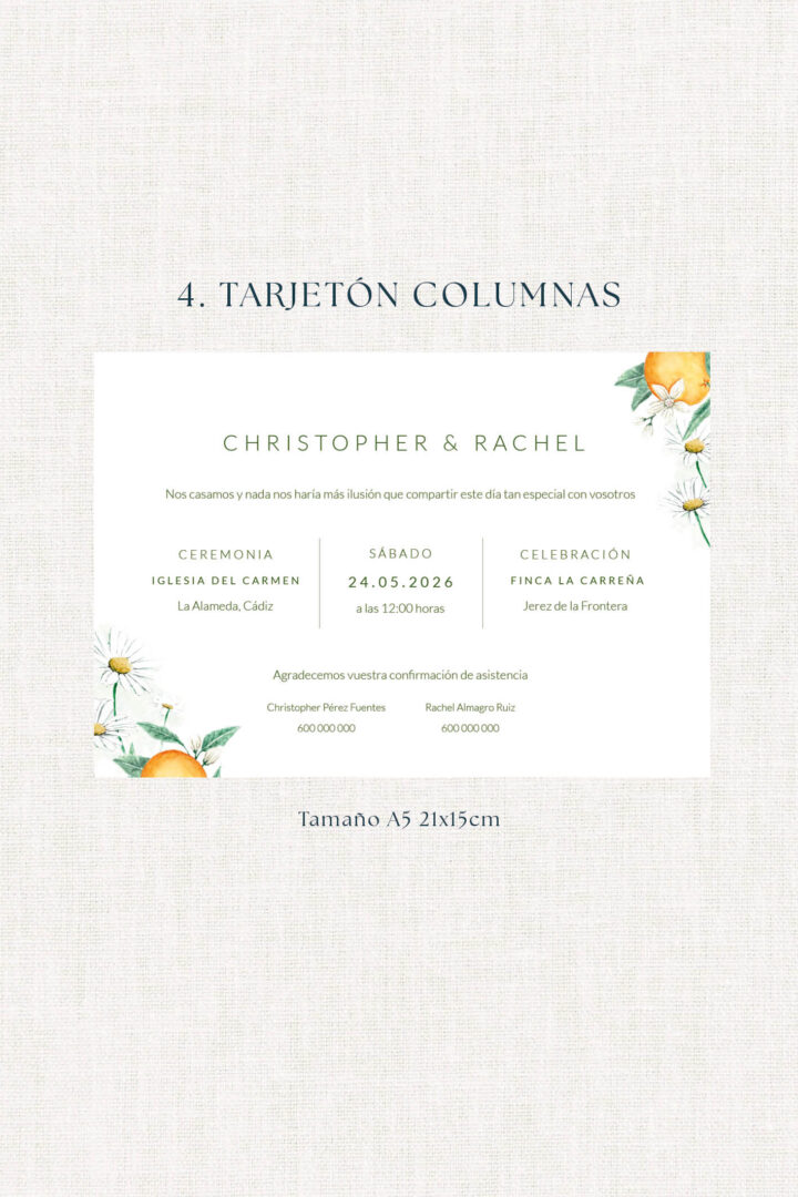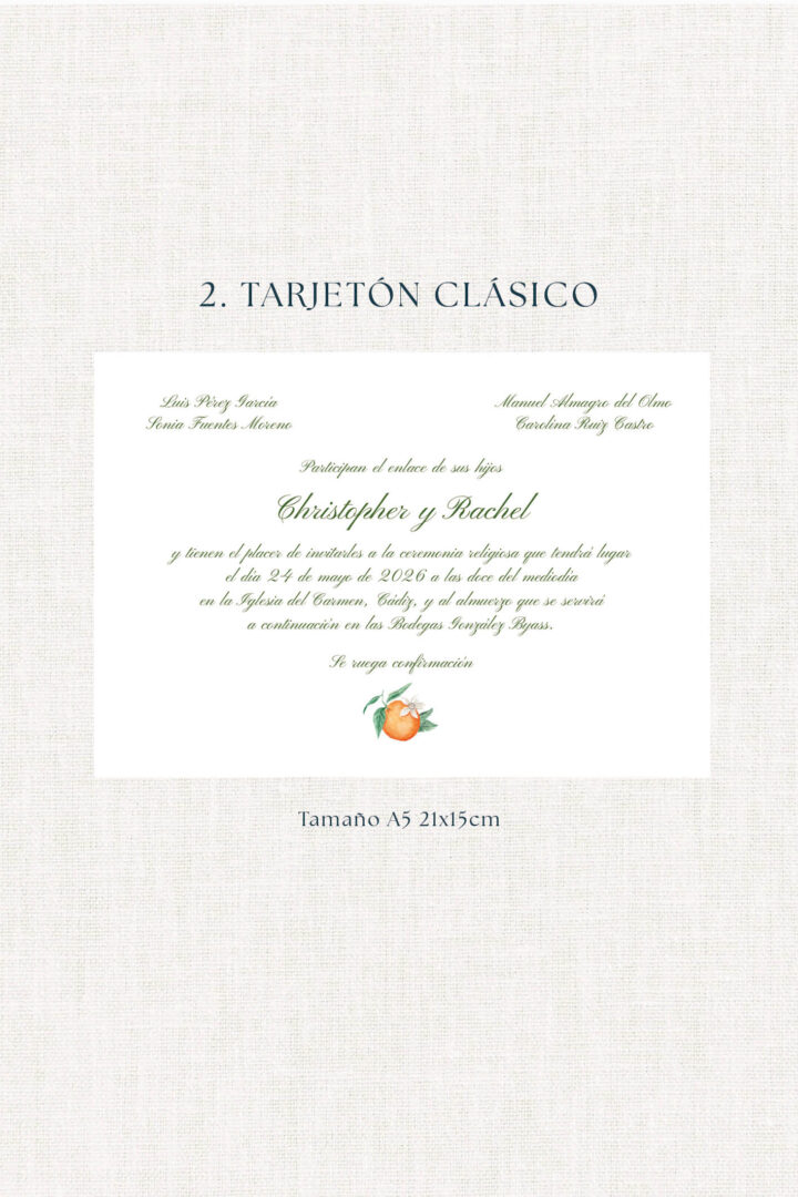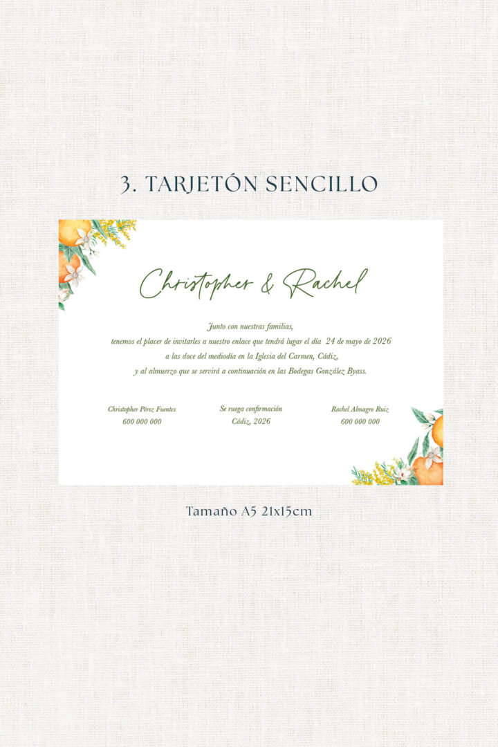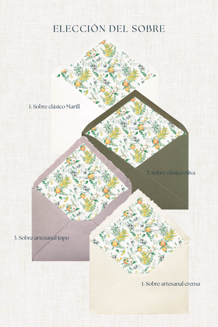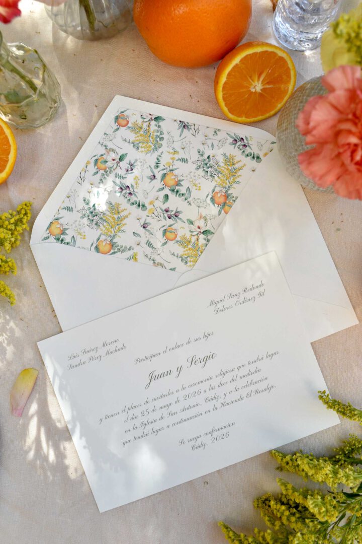 La invitación Azahar representa una mezcla fresca y elegante que abre la puerta a una fiesta alegre y natural. Perfecta para parejas que sueñan con una boda al aire libre, con música, brindis largos y detalles artesanales.
