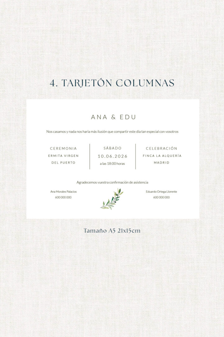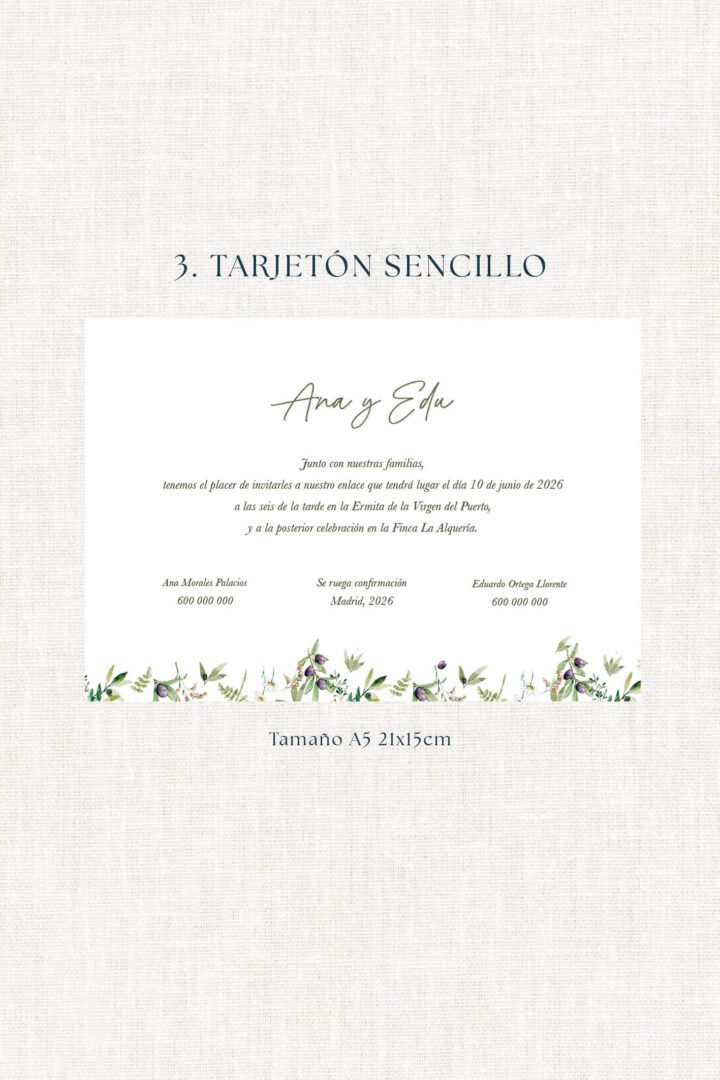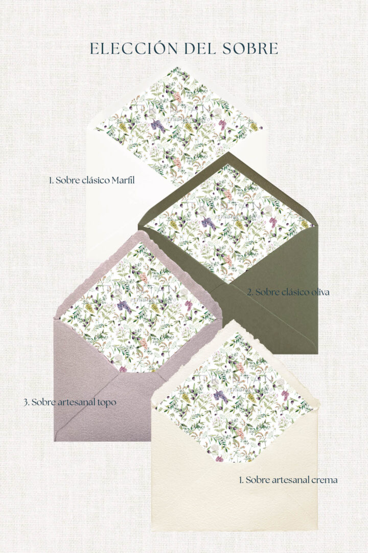La invitación Olivos está inspirada en el Mediterráneo: ramas verdes, luz de atardecer, frescura y elegancia. Ideal para parejas que buscan una boda natural y luminosa, con música al aire libre y fotos entre jardines.