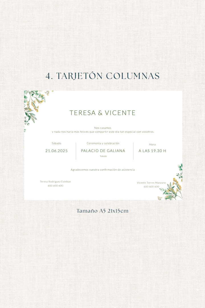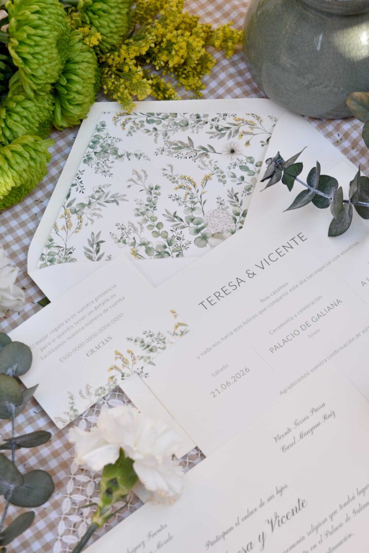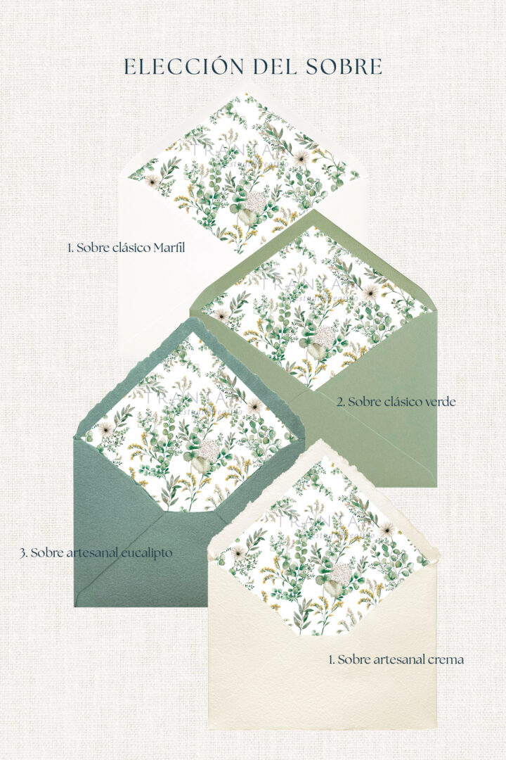 La colección Bosque se inspira en la naturaleza en su estado más puro, con ilustraciones de ramas, hojas y flores silvestres en tonos verdes, blancos y dorados suaves. Las invitaciones destacan por su equilibrio entre elegancia y frescura. Ideales para bodas en entornos naturales, transmiten serenidad y sofisticación a partes iguales.