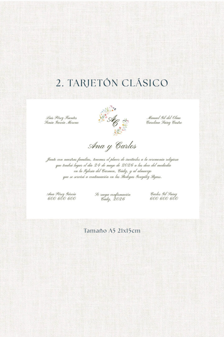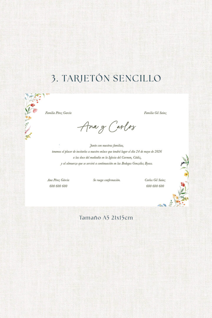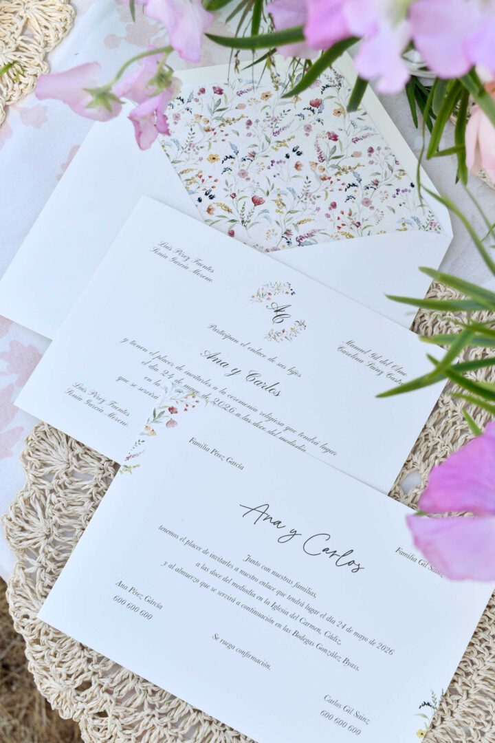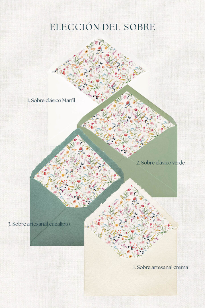 La invitación Frida es una ráfaga de campo en plena floración que evoca mañanas de primavera, brazos llenos de peonías y esa alegría tranquila de celebrar al aire libre. Perfecta para parejas románticas y sensibles al detalle, que aman los paseos por jardines, la artesanía y lo natural antes que lo estridente.