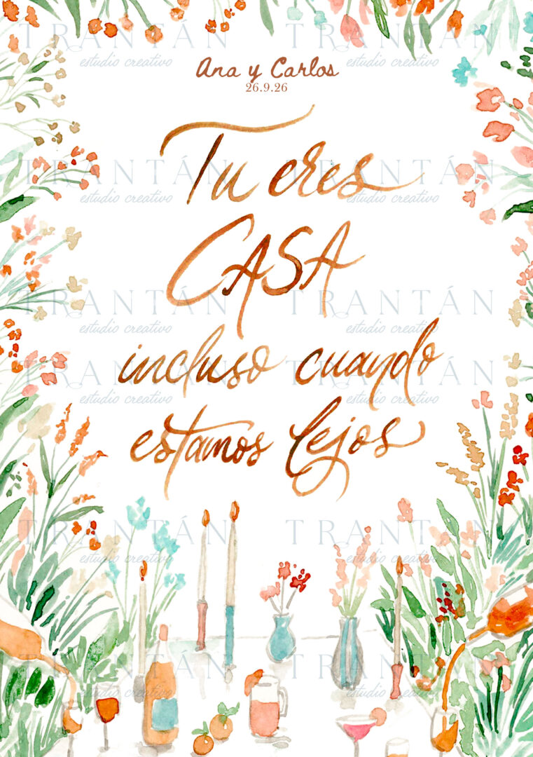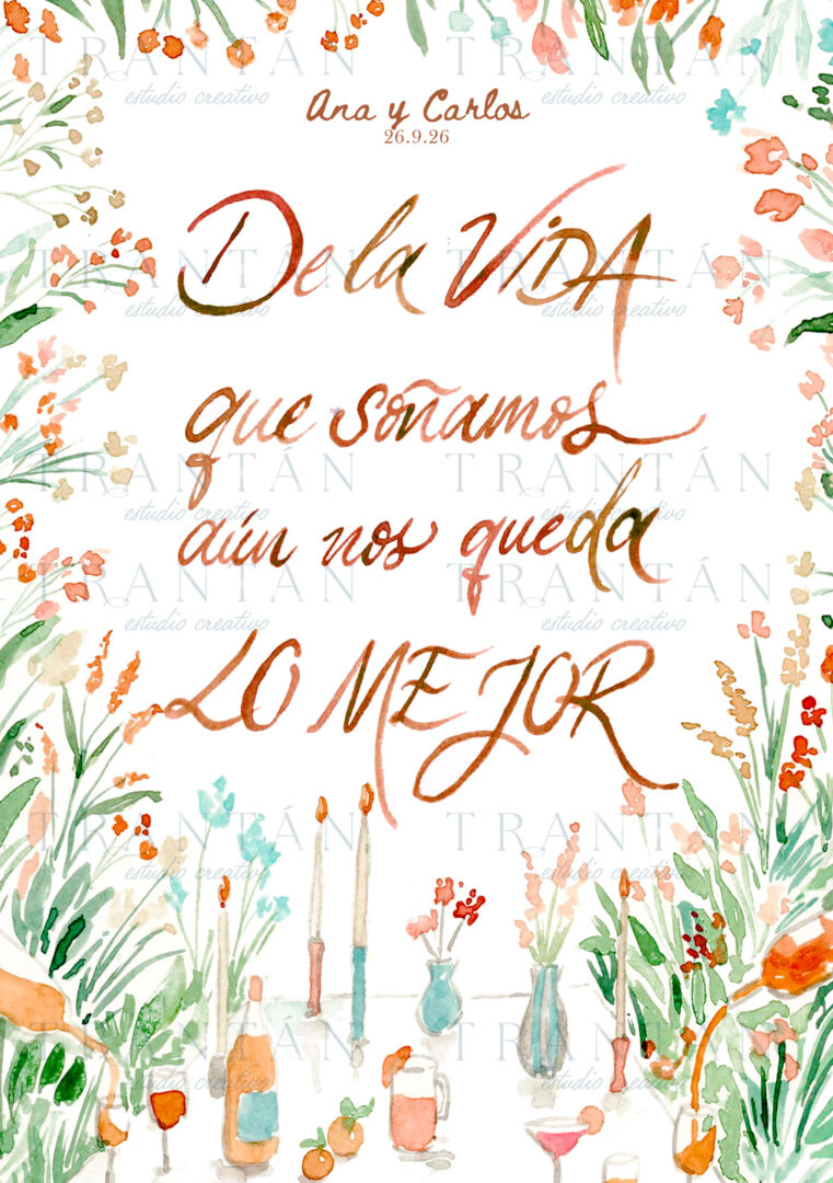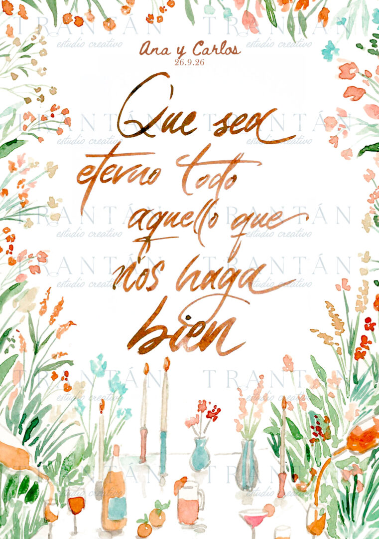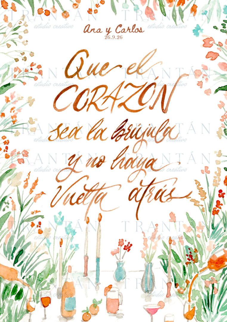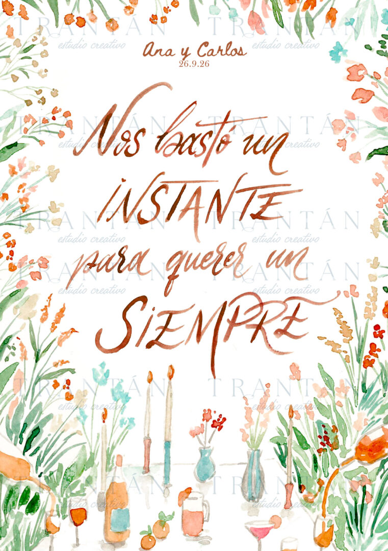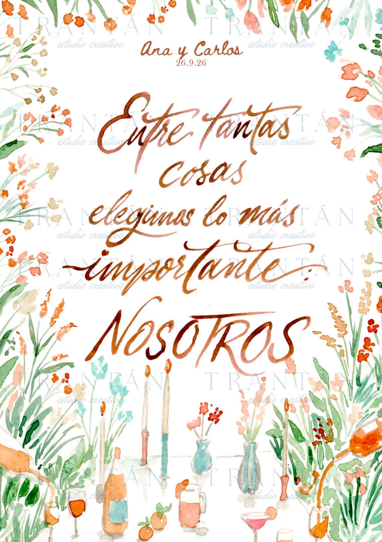 1. Puedes dejarnos escrito vuestros nombres y fecha de boda para personalizar la lámina. 2. Elige una de nuestras frases de colección o escribe la tuya personal. 3. Decide el tamaño de la tarjeta.