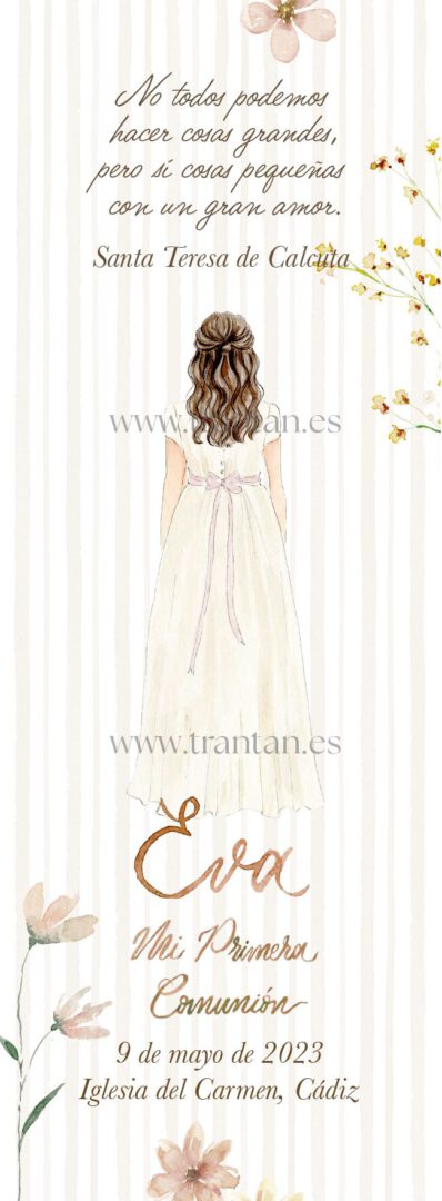 Podéis elegir el modelo que más os represente —Carmen, Emma, Lucía, Inés, Marina, Gracia o Celia— y lo ajustamos para que se parezca a ella: color de pelo (rubio, castaño o moreno) y color del lazo del vestido (rosa, azul verdoso o beige). Personalizamos también nombre, fecha y lugar de la celebración para que todo tenga sentido y armonía dentro de vuestra papelería de Comunión.