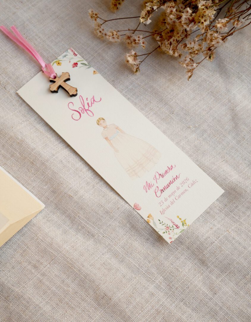 El formato alargado es perfecto como detalle para familiares y amigos: práctico, bonito y con ese aire dulce y natural que enamora. Un recuerdo único que acompaña lecturas y momentos, y que guarda para siempre la magia de la Comunión. ¿Preparadas para sorprender con un detalle cuidado de principio a fin?