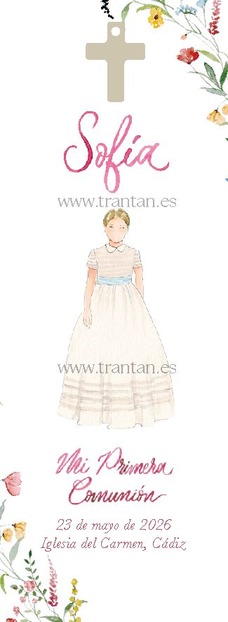 Podéis elegir el modelo que más os represente —Carmen, Emma, Lucía, Inés, Marina, Gracia o Celia— y lo ajustamos para que se parezca a ella: color de pelo (rubio, castaño o moreno) y color del lazo del vestido (rosa, azul verdoso o beige). Personalizamos también nombre, fecha y lugar de la celebración para que todo tenga sentido y armonía dentro de vuestra papelería de Comunión.