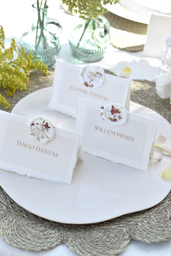 • Nombre del invitado en papel vegetal y sello de lacre con pétalos de flor preservada.