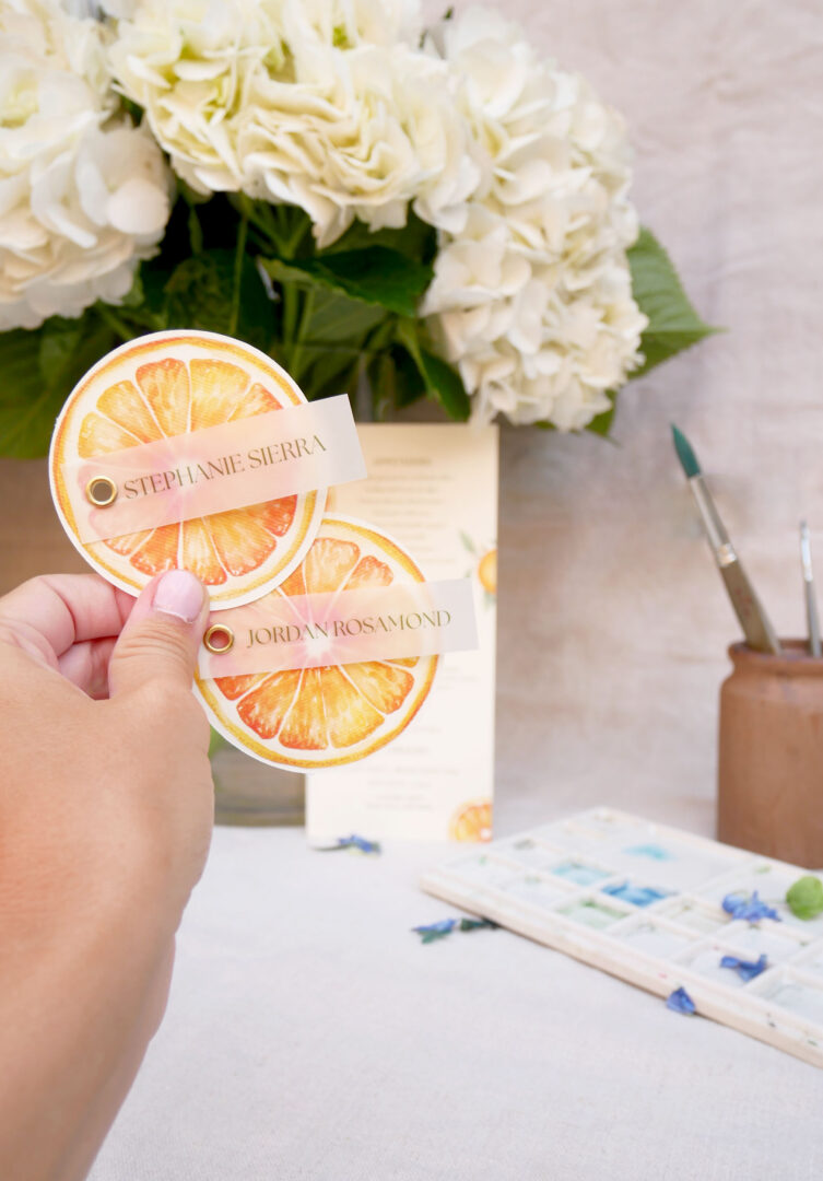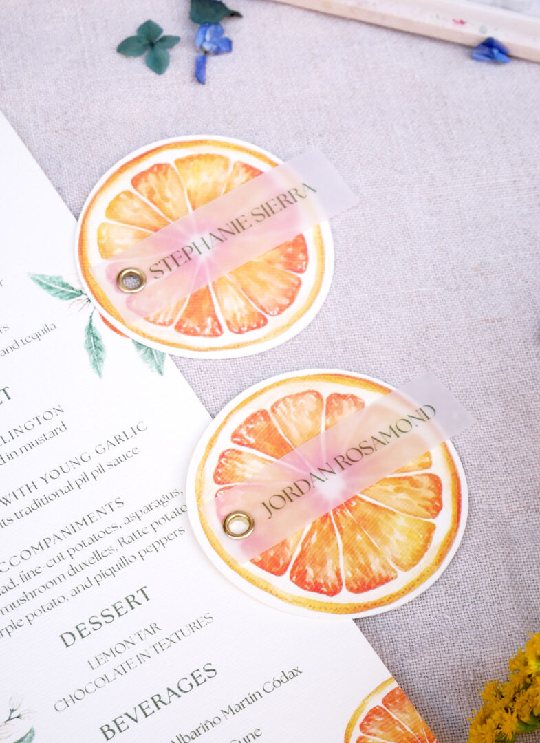 • Corte troquelado con forma de naranja con taladrad, remache y papel vegetal.