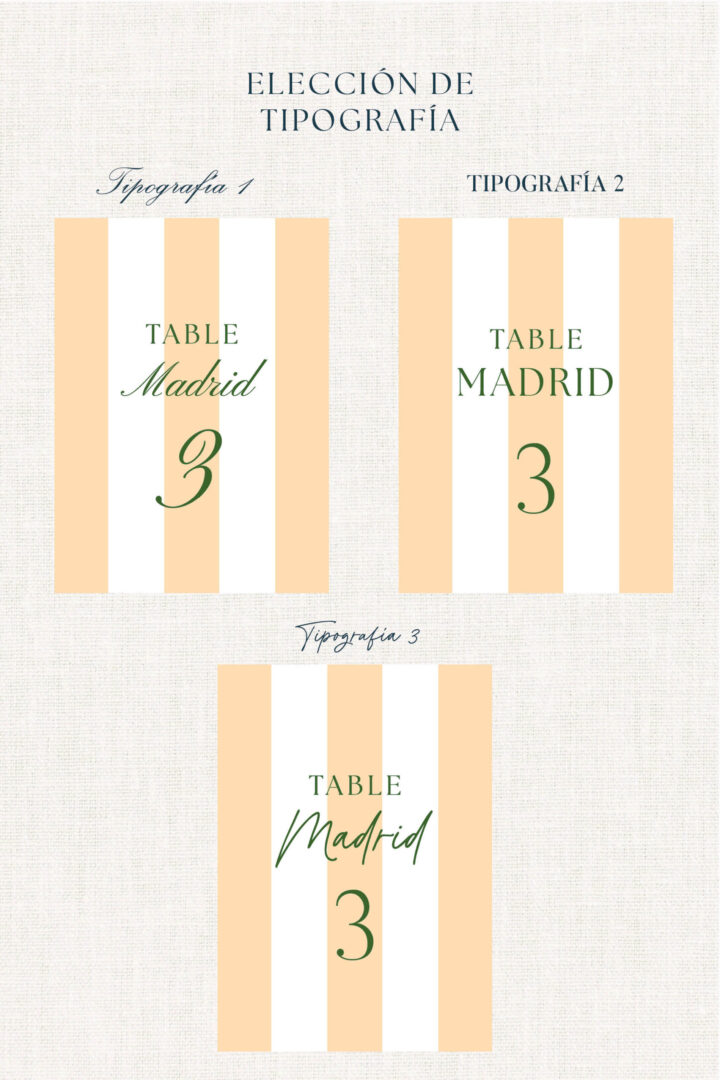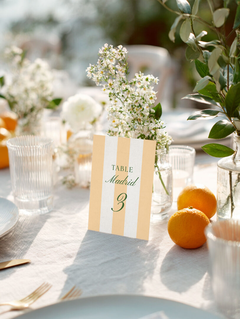 El mesero Azahar aporta ritmo y color soleado a cada mesa. Enmarca el número con un aire veraniego que enlaza con la invitación y da coherencia a toda la papelería. Combínalo con un mantel de lino natural y un centro de mesa con acento fresco para conseguir una mesa viva, actual y muy fotogénica.