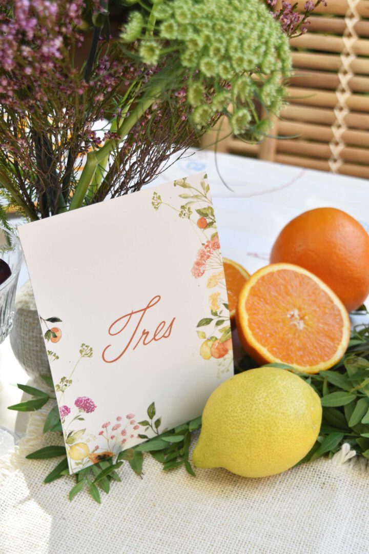 El mesero Frutas aporta carácter con sus laterales florales y el guiño anaranjado de la numeración. Viste la mesa con un toque luminoso que invita a brindar. Funciona de maravilla con madera clara, velas color miel y cristal tallado. Orden bonito con mucha personalidad.