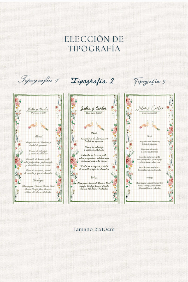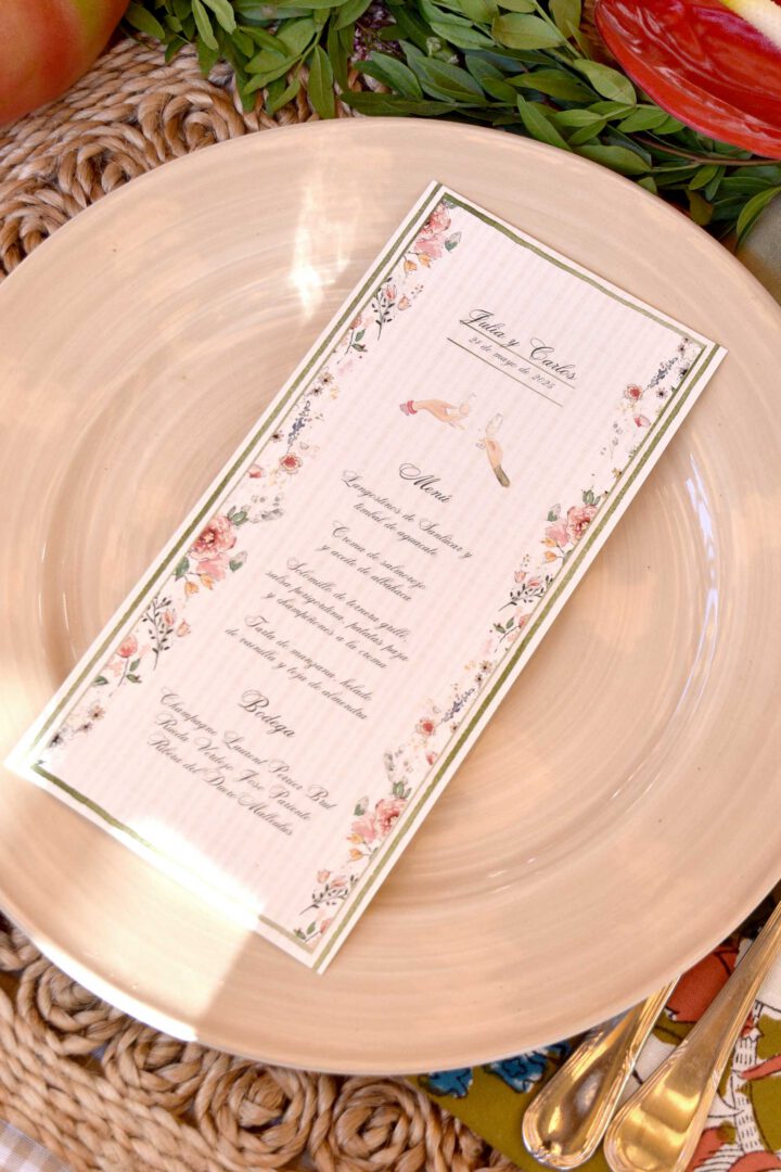 La minuta Floral es el broche de la mesa: marco verde, flores delicadas y composición ligera que acompaña cada plato. Suma color sin recargar y crea un hilo precioso con el mesero y el seating. Combínala con manteles neutros, velas cálidas y una ramita floral sobre la servilleta.