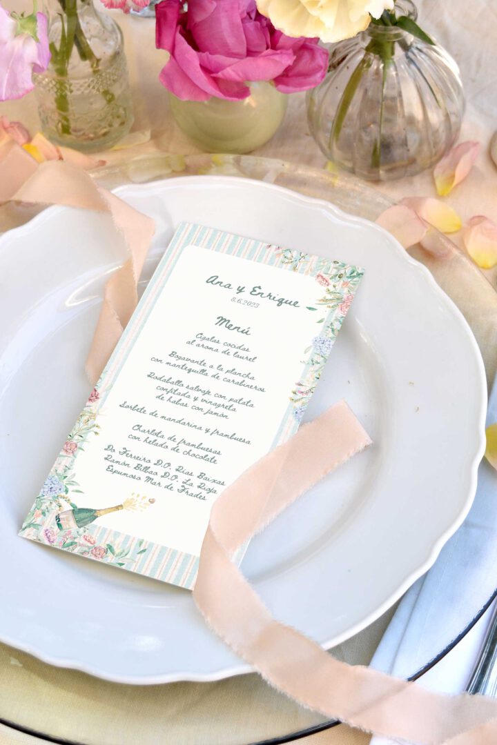 La minuta Florecer funciona como un mini ramo en papel: aporta pinceladas de color, ritmo y un toque festivo que levanta la mesa al instante. Enmarca el menú y, a la vez, armoniza la paleta de toda la papelería, creando continuidad con el mesero y el seating. El resultado es una mesa viva, armónica y con ese guiño artesanal que tus invitados comentan incluso antes del primer bocado.
