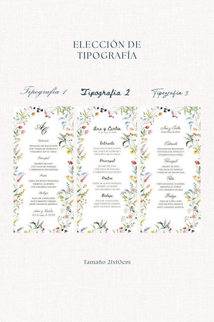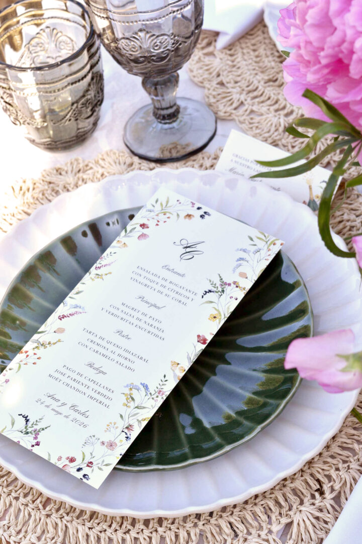La minuta Frida se posa sobre el plato como un pequeño jardín. Viste el sitio de cada invitado y añade color sin pesar. Combínala con vajilla blanca y verde botella, servilletas de algodón natural y centros con peonías, ramas de olivo y flores de temporada para darle un toque romántico con alma de jardín.