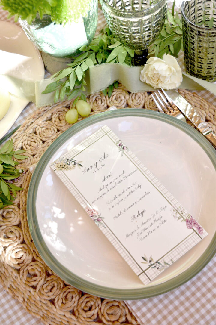 La minuta Olivos suma color suave y naturalidad, dando resultado a una mesa cálida, colorida y muy fotografiable. Combínala con manteles en estampados suaves, bajoplato de ratán, cristalería en tonos verdes  y vajilla con un toque de color.
