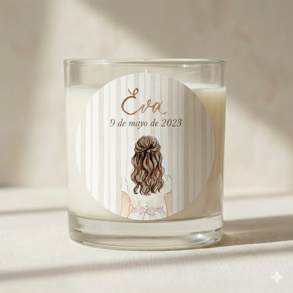 Podéis elegir el modelo que más os encaje —Carmen, Emma, Lucía, Inés, Marina, Gracia o Celia— y lo adaptamos para que se parezca a ella: color de pelo (rubio, castaño o moreno) y color del lazo del vestido (rosa, azul verdoso o beige). También personalizamos nombre, fecha y lugar para que cada pegatina cuente su historia con delicadeza.