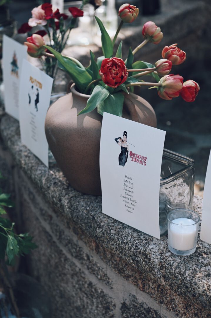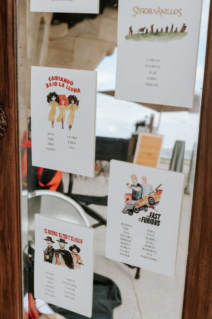 Un viaje por la gran pantalla. Este seating plan está inspirado en las películas que nos hacen soñar, reír y emocionarnos, ilustradas en acuarela con el encanto y la personalidad que caracteriza a Trantán.