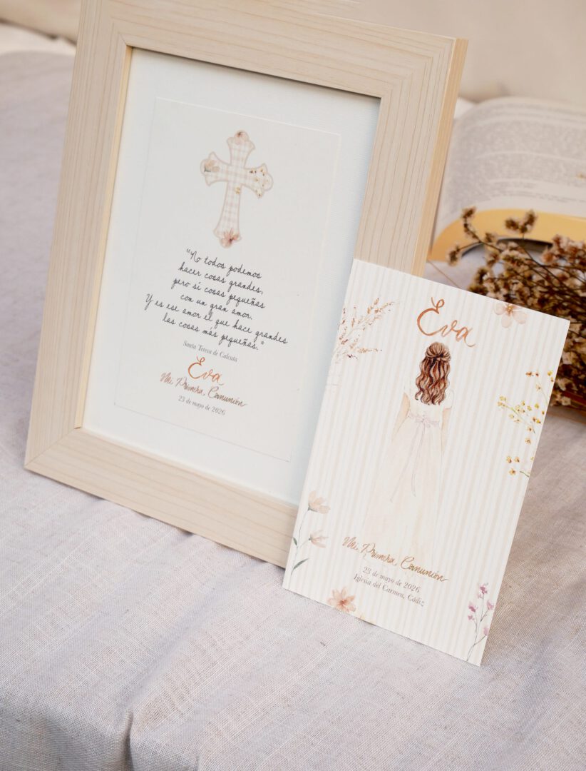 Los recordatorios de Comunión – Modelo Brisa tienen ese aire dulce y natural que enamora. Una papelería pensada para guardar la magia del día, suave, elegante y muy cuidada, perfecta para sorprender a la familia con un recuerdo único que se guardarán para siempre.