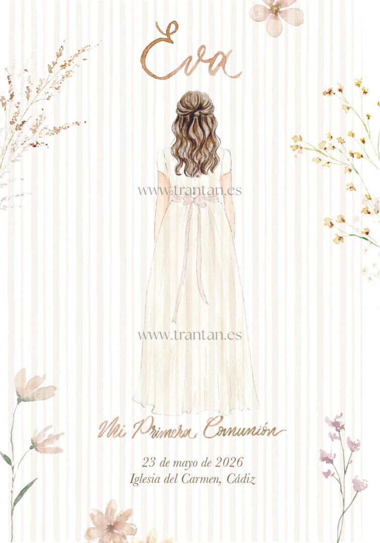 Puedes elegir el modelo de niña que más os represente: Carmen, Emma, Lucía, Inés, Marina, Gracia o Celia. Después, ajustamos los detalles para que se parezca a ella: color de pelo (rubio, castaño o moreno) y color del lazo del vestido (rosa, azul verdoso o beige). También personalizamos nombre, fecha y lugar de la celebración para que todo tenga sentido y armonía.