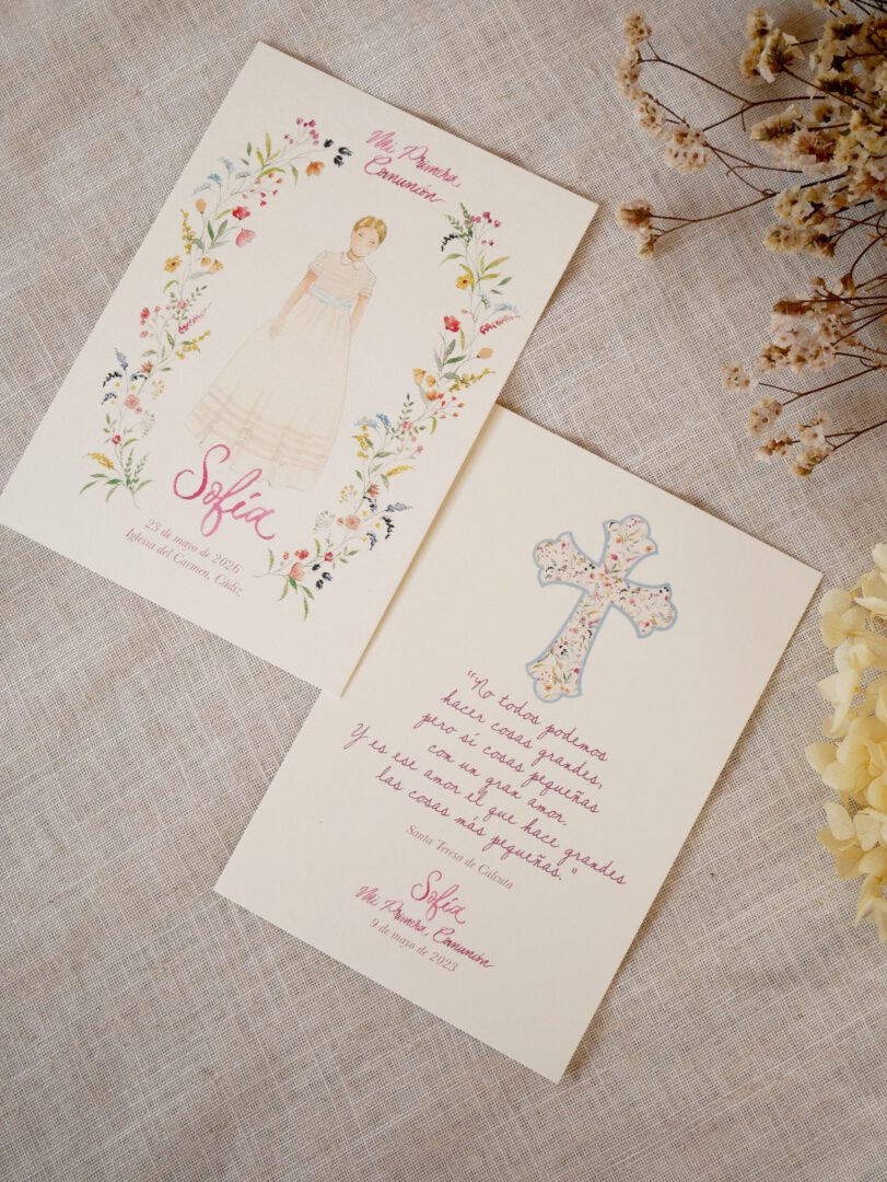 Los recordatorios de Comunión – Modelo Frida tienen ese aire dulce y colorido que enamora. Una papelería pensada para guardar la magia del día, suave, elegante y muy cuidada, perfecta para sorprender a la familia con un recuerdo único que se guardarán para siempre.