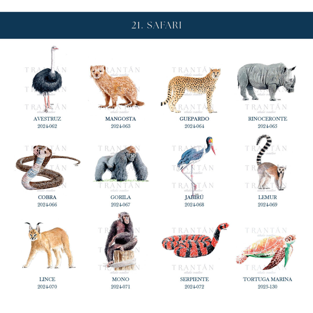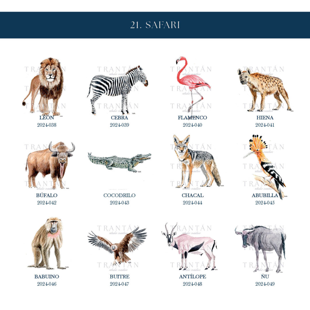 Cada mesa lleva el nombre de un animal diferente —león, jirafa, elefante o cebra—, ilustrado en acuarela con el equilibrio perfecto entre elegancia y fuerza. Un detalle original y sofisticado que convierte el momento de buscar el sitio en un pequeño viaje lleno de emoción.