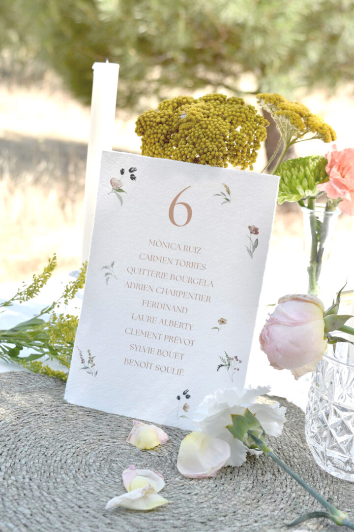 El seating Artesana combina detalles botánicos con un tono terracota suave y convierte el panel de mesas en un rincón fotogénico. Encaja con estructuras de madera o hierro, cuerdas y pinzas, o marcos dorados; ideal para parejas que desean coherencia visual en toda su papelería de boda y que les gusta cuidar cada detalle.