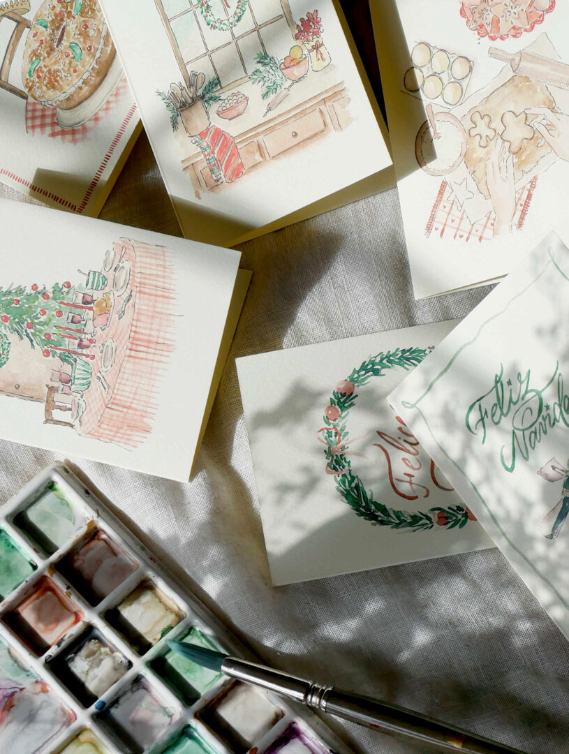 Una vez terminadas las ilustraciones, pasaremos a la fase más especial: digitalizaremos tu diseño para que puedas llevarte a casa 8 postales navideñas impresas en papel de alta calidad, con sus sobres a juego, listas para enviar.